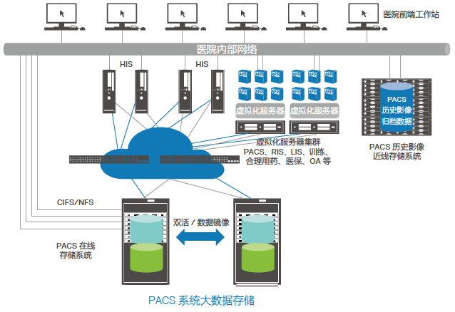 高速调用影像:采用 SAN+NAS 存储作为核心存储,存储 PACS 系统数据库和在线的 PACS影像文件,提供高速的数据访问能力;